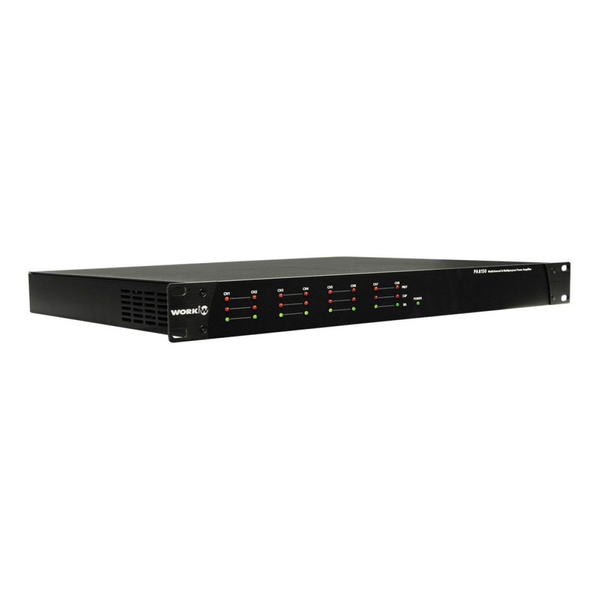 PA 8150 is a 150 W @ 4 Ohm 8 channel Class D professional audio amplifier, built in 1 rack unit metal enclosure. It has balanced inputs and outputs with Euroblock connectors. On the front panel power, signal, clip and protection indicators. On the back are the power switch, connections and independent volume control per channel.
