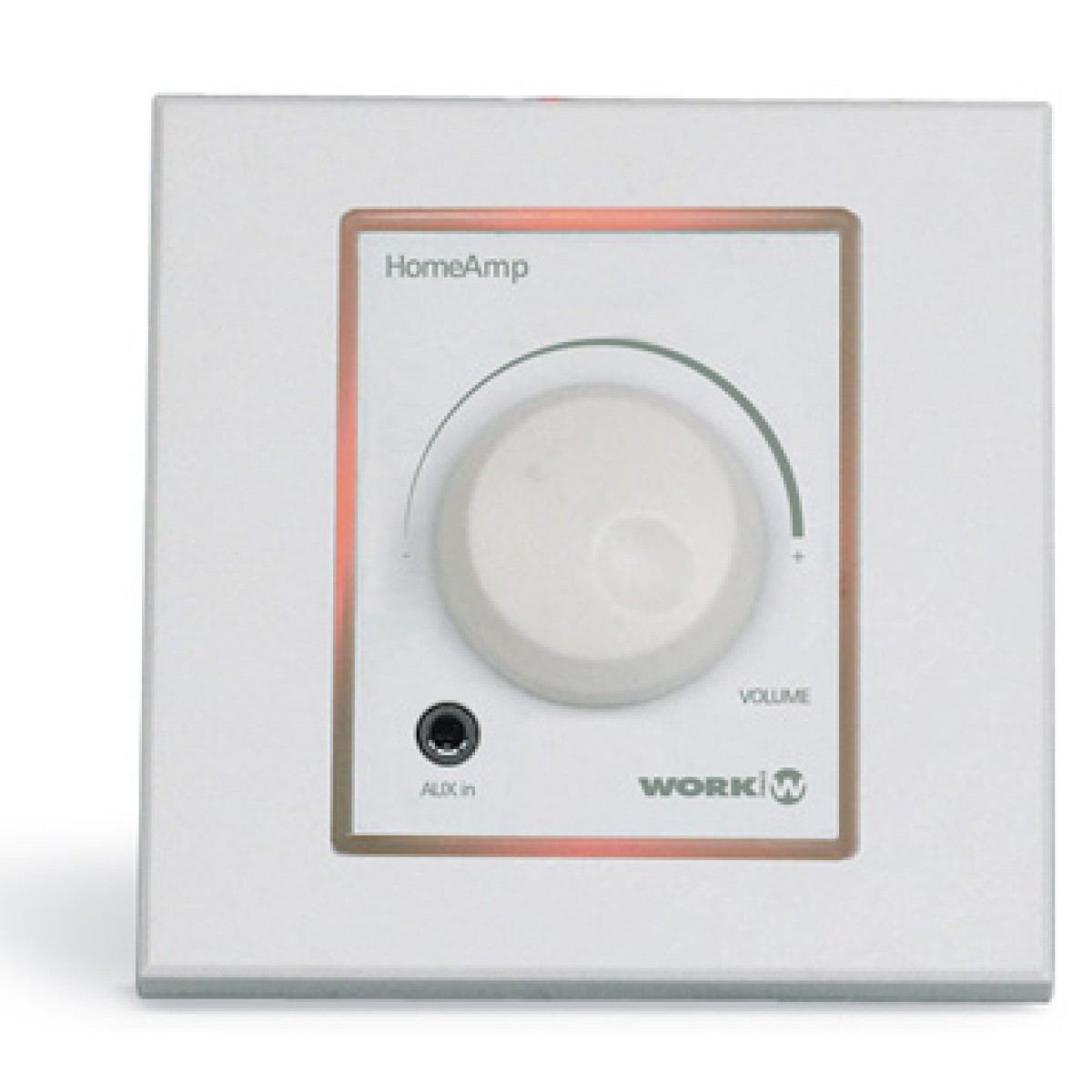 Home eAMP is a ultra-compact amplifier of 2 x 20 W with audio controller. It features two audio inputs, so users (e.g. customers of an hotel) can choose between background music coming from the rear input and their personal audio player, which can be directly connected to the front panel input of the device (with priority).