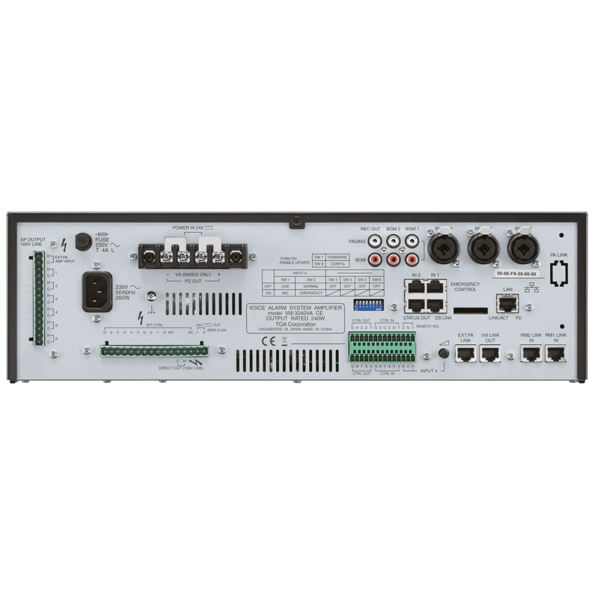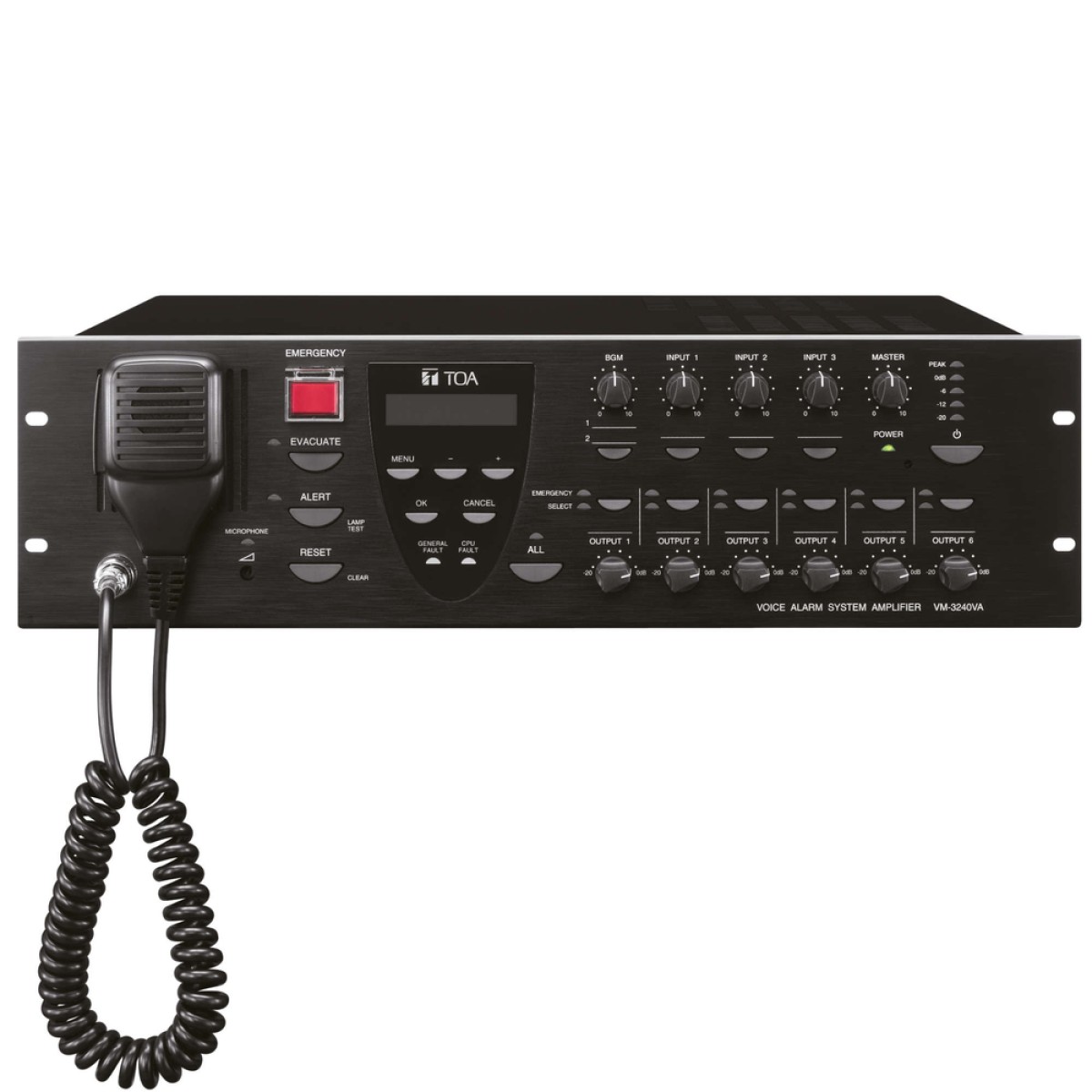 The VM-3240VA is a multifunctional amplifier that can be mounted in an EIA-Standard equipment rack (3-unit size). The unit comes with audio inputs including the background music input, and the speaker output section which has an internal attenuator and 5-output selector. It permits not only general-purpose broadcast, but also Emergency Broadcast based on the EN60849 Standard which gives pre-recorded voice instructions in the emergency situation. Broadcast can be made from an optional RM-300MF Remote Microphone as well as from the amplifier, and can be remotely controlled from external equipment. In addition, the unit features the surveillance function which automatically checks the system for failures.