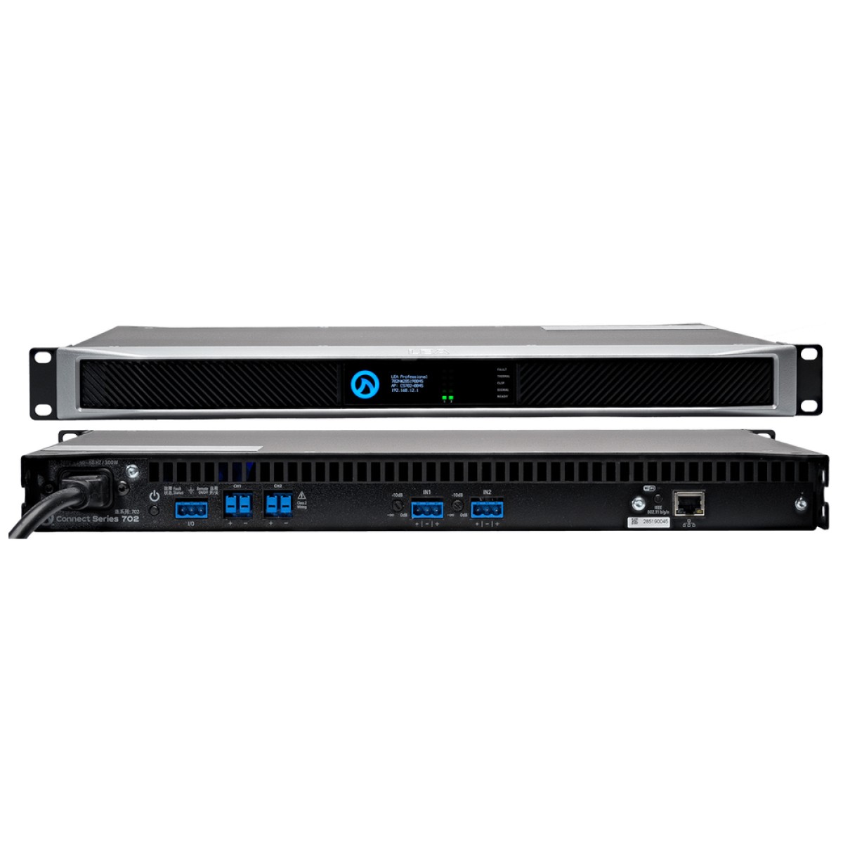 Power amplifier 2x700Wrms @ 4Ω, 8Ω, 70V and 100V (2x350W @ 2Ω). Internal DSP w/ Crossovers, IoT Device with built in WiFi Hotspot, Wifi or FAST Ethernet connectivity and Highly Efficient Power Supply with Class D Output Stage. Dimensions: 362mm x 482mm x 1U, Weight: 9.1 Kg