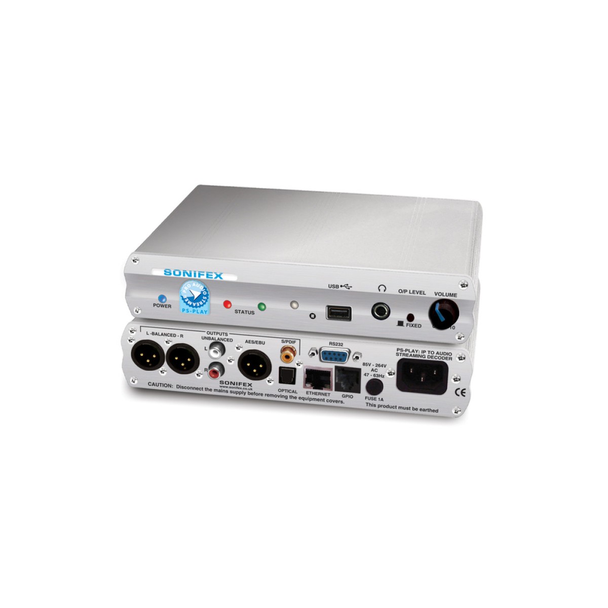 The PS-PLAY is a freestanding IP to audio converter which is also available in a 1U rack-mount as the PS-PLAYS. It takes an IP audio feed and converts it to a number of simultaneous stereo outputs: balanced and unbalanced analogue audio, AES/EBU, S/PDIF & TOSlink digital audio outputs.