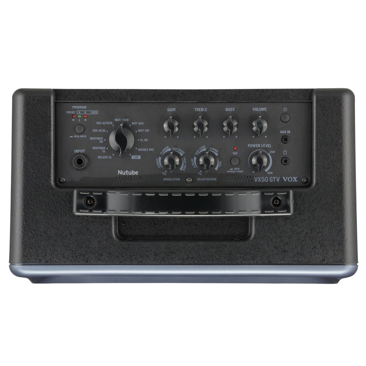 Ενισχυτής ηλεκτρικής κιθάρας Vox VX50-GTV, ισχύος 50W, τεχνολογία Nutube 6P1, μεγάφωνο 8'', 11 μοντέλα ενισχυτών, 8 διαφορετικά εφφέ, 11 ήχοι Preset, 2 ήχοι User, EQ τριών περιοχών, έξοδος ακουστικών, περιλαμβάνεται τροφοδοτικό λειτουργίας (DC 19V), διαστάσεις 354x208x313mm, βάρος 4,1 kg.