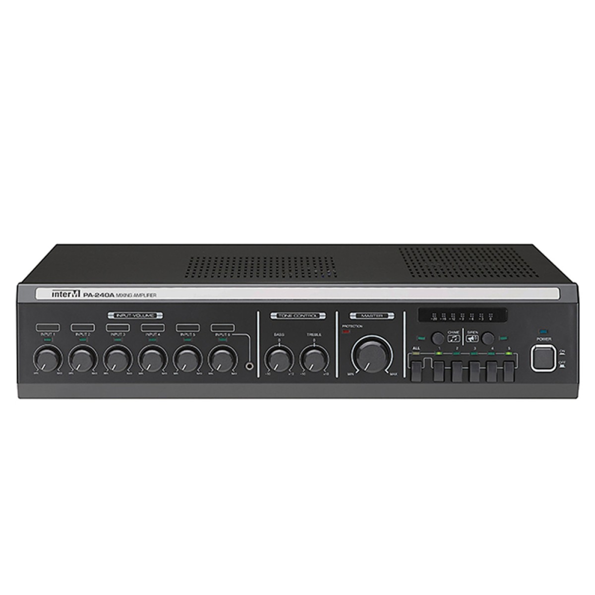 Μίκτης/ενισχυτής 240WRMS/100V ή 4-8Ω, τάξης D, 5 ζωνών On-Off, με 3 εισόδους MIC/LINE σε XLR/ Phoenix, δυνατότητα Phantom Power με διακόπτη On/Off και ρύθμιση Gain, 2 Stereo In με Phoenix και 1 με Rca, 1 Mic priority ρυθμιζόμενης ευαισθησίας, επιπλέον εισόδους EXT IN, TEL IN & έξοδο MIX OUT, ρύθμιση τονικότητας BASS/TREBLE, πλήκτρα chime & siren. Διαστάσεις 420 x 88 x 319 mm, βάρος 9,75kg. Κατάλληλο για μικρούς ναούς, ξενοδοχεία, cafe-bar.