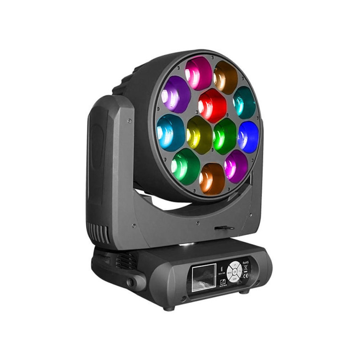 Κινητή κεφαλή LED Wash 12x40W RGBW Εύρος κίνησης: Pan 540°/Tilt 270° 16Bit, Dimmer, Strobe 0,5-25/sec, Ευρος ζούμ 4°-60° με περιστρεφόμενο φακό. Λειτουργεί με Master/Slave, Music, Auto, RDM Standard, DMX512 (XLR 3 pins), χρησιμοποιώντας 11,17,18 ή 58 κανάλια. Διαθέτει: LCD screen για διευθυνσιοδότηση και τοπικές ρυθμίσεις. Τροφοδοσία 110-240AC 50/60Hz, κατανάλωση: 550W. Βάρος: 18 κιλά. Διαστάσεις: 30x23x37cm.. Βαλίτσα μεταφοράς ανά 2 τεμάχια συμπεριλαμβάνονται στη τιμή. Χρήσεις: Κέντρα διασκέδασης, Συναυλίες, Club, Θέατρα, disco κ.λ.π.