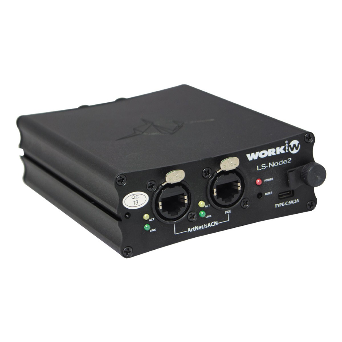 Το LS-Node 2 είναι ένας μετατροπέας που υπαστηρίζει διαφόρου τύπου πρωτόκολλα επικοινωνίας, είναι συμβατό με όλες τις κονσόλες φωτισμού και τις συσκευές που υποστηρίζουv ArtNet,sACN standards. Διαθέτει 2 RJ45 ArtNet/sACN ports, 4x5pin με δύο DMX I/O (Ethernet-RDM/DMX bidirectional transceiver). Kάθε i/o ρυθμίζεται ξεχωριστά, μπορεί να λειτουργήσει σαν Merger HTP/LTP ή σε backup mode, έχει ρυθμιζόμενο dmx frame rate, USB Type-C port για τροφοδοσία. Διαστάσεις: 129x109x42mm